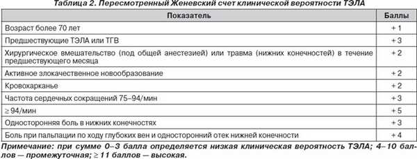 С целью более адекватной диагностики ТЭЛА были предложены различные шкалы для подтверждения вероятности ее развития. Одной из наиболее используемых из этих шкал был Женевский счет клинической вероятности ТЭЛА. В данной шкале все факторы риска развития ТЭЛА распределялись по баллам, а суммарное количество баллов говорило о величине вероятности развития ТЭЛА у конкретного пациента.