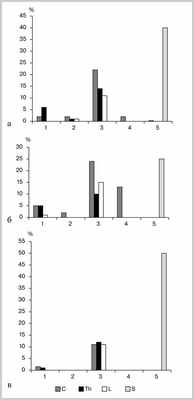 У 43 ППС зафиксировали 85 травм позвонков (среднее значение 1,98), из них 21 (24,71%) перелом крестцовых и 64 (75,29%) перелома других отделов позвоночника (см. рисунок, б). В отличие от группы водителей, шейные позвонки у ППС травмировались чаще (43,53%). По механизму образования разгибательные переломы у ППС были выявлены в 48,23%, реже (12,94%) наблюдали комбинированное сгибание.