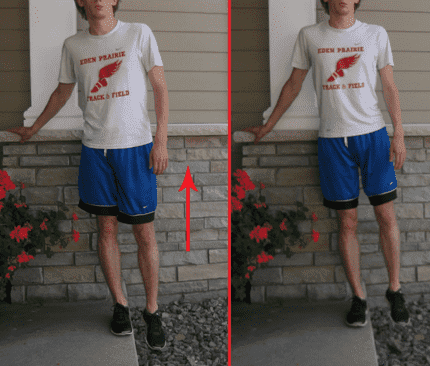 Упражнения, укрепляющие правую среднюю ягодичную мышцу. (A) Исходная позиция — стоя на платформе, колено правой ноги выпрямлено. Левой ногой опускаются вниз за счет перекоса таза, затем (В) медленно поднимают левую ногу, выравнивая таз. Это движение осуществляется преимущественно за счет средней ягодичной мышцы