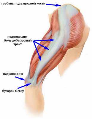Анатомия подвздошно-большеберцового тракта. В нижней части тракт крепится к большеберцовой кости (в этом месте есть бугорог Gerdy), часть передних волокон идет кпереди и крепится к нарудной поверхности надколенника (коленной чашечки), а третья часть волокон идет кзади и крепится к сухожилию двуглавой мышцы бедра