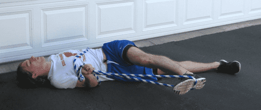 Тест Обера, выполняемый самостоятельно. Рыжимии стерелками показано место появления боли при синдроме подвздошно-большеберцового тракта при приведении ноги за срединную линию тела