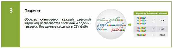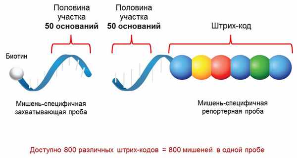 Технология nCounter основана на прямой цифровой детекции мишеней с помощью флуоресцентных штрих-кодов. На выбранные мишени синтезируются два зонда: захватывающая проба - олигонуклеотид меченный биотином и репортерная проба – олигонуклеотид на одном своем конце содержащий уникальный цветовой штрих-код из 4 разных флуорофоров в 6 позициях. Каждая такая цветовая последовательность указывает на конкретную мишень.