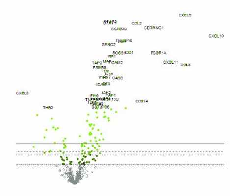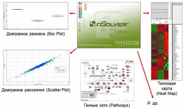 Программное обеспечение nSolver позволяет производить анализ полученных данных и визуализировать результаты в различных форматах без использования дополнительных биоинформатических ресурсов. Система в режиме Advanced Analysis визуализирует генные сети и отмечает цветом гиперэкспрессированные гены и гены, экспрессия которых подавлена.