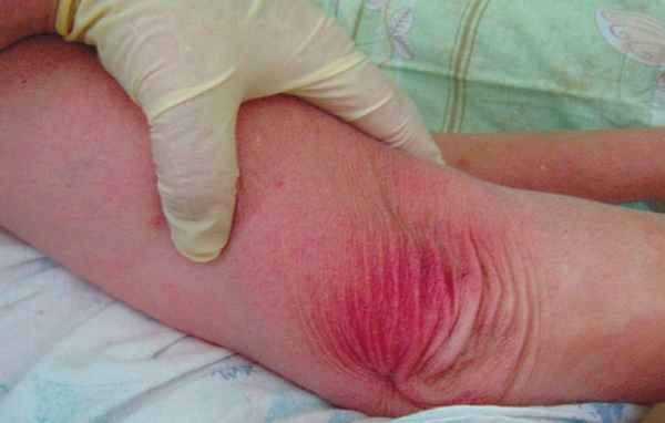 Как выглядит: Цвет кожи — синюшно-красный, пятна с четкими краями; кожа с поверхностными повреждениям — потертостостями, пузырями. Обычно уже сопровождается болью.