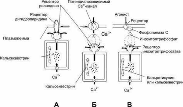 Рецепторыдигидропиридинавстроены в плазмолемму и реагируют на изменения её МП: изменение конформации рецепторов дигидропиридина активируетрецепторы рианодинаи приводит к выбросу Ca 2+ из депо. Подобный механизм функционирует в саркоплазматическом ретикулуме волокон скелетной мышцы.