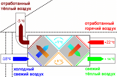 Принцип рекуперации основан на передаче тепла вытесняемого воздуха теплообменнику, в результате чего снижаются расходы на отопление. Наиболее распространение получили рекуператоры пластинчатого и роторного типа, а также установки с промежуточным теплоносителем. КПД этого оборудования достигает 60-85%.
