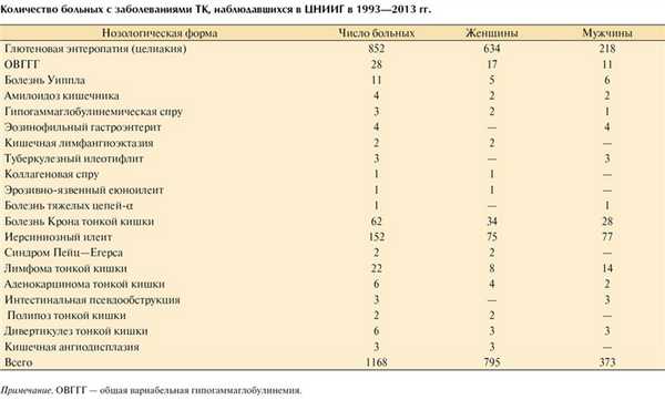 Болезни тонкой кишки характеризуются специфическими морфологическими изменениями слизистой оболочки тонкой кишки (СОТК) разной степени выраженности. В большинстве случаев болезни ТК имеют тяжелое, часто прогрессирующее течение. За 1973-2013 гг. в отделении патологии кишечника Центрального научно-исследовательского института гастроэнтерологии (ЦНИИГ) наблюдались 1168 больных с разными заболеваниями ТК (см. таблицу).