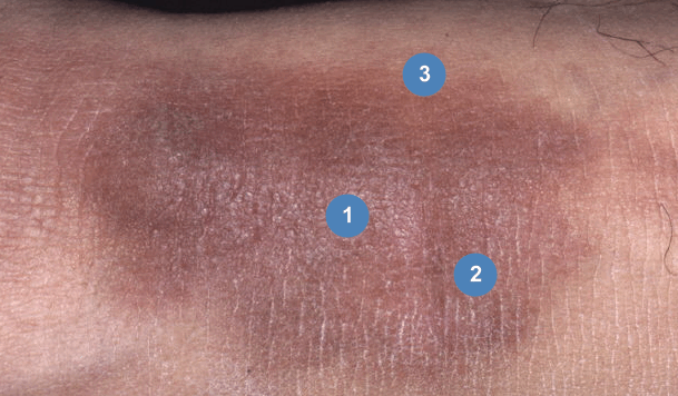 - Стадия инфильтрации. На этой стадии кожа начинает покрываться бороздками, приобретая при этом сильно болезненный вид. На кожном покрове образуются крупные уплощенные новообразования округлой формы. Однако после угасания симптомов заболевания пигментация будет сохраняться. Может также возникнуть шелушение, трещины, а кожа будет отличаться повышенной жесткостью и плотностью.