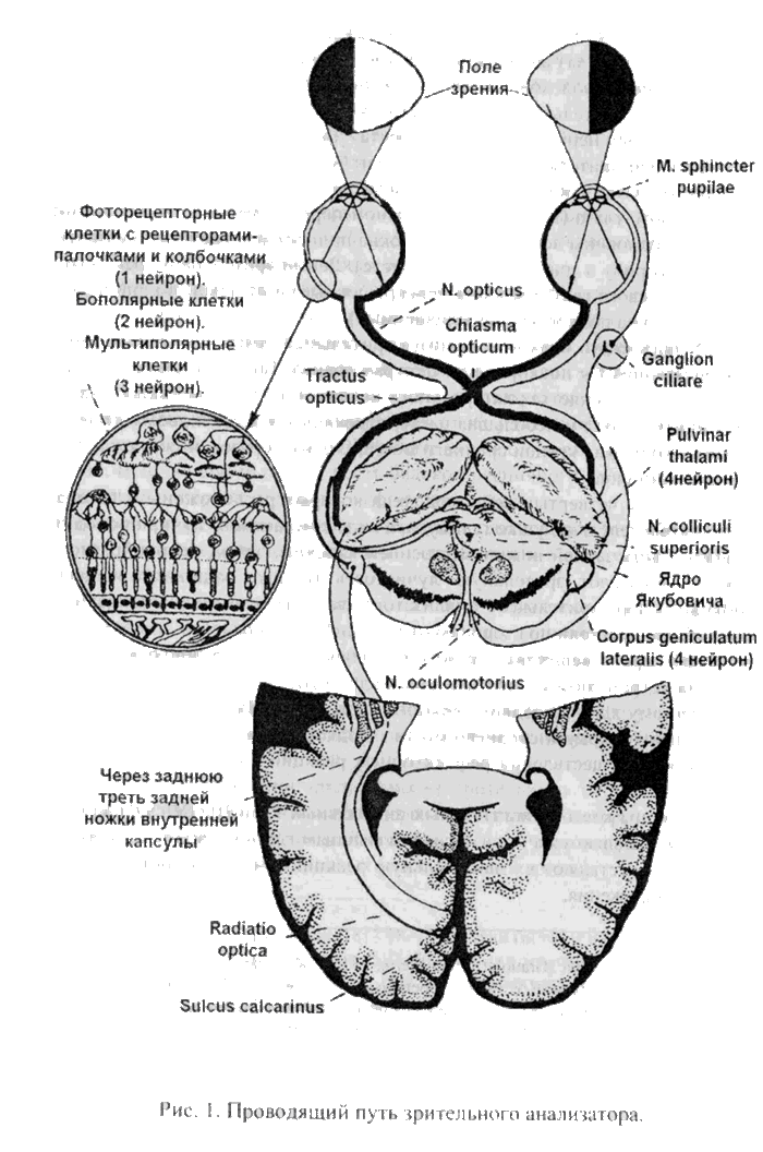 Проводящий путь зрительного анализатора обеспечивает проведение нервных импульсов от сетчатки в корковые центры полушарий больного мозга и представляет собой сложную цепь нейронов, связанных друг с другом при помощи синапсов (рис. 1).
