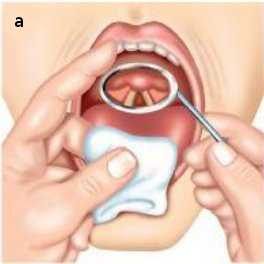 - Введение зеркала в ротовую полость происходит по тому же принципу, как и при задней риноскопии. После чего язычок приподнимается, чтобы обеспечить визуализацию глотки. При необходимости также приподнимается мягкое небо.