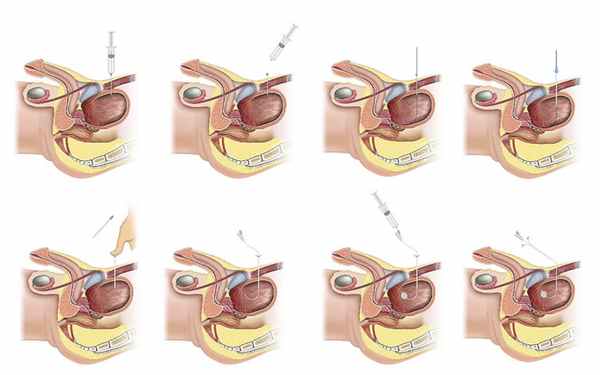 2) ось иглы должна быть ориентирована горизонтально. Конец иглы может быть направлен немного кверху во избежание прокола прямой кишки.