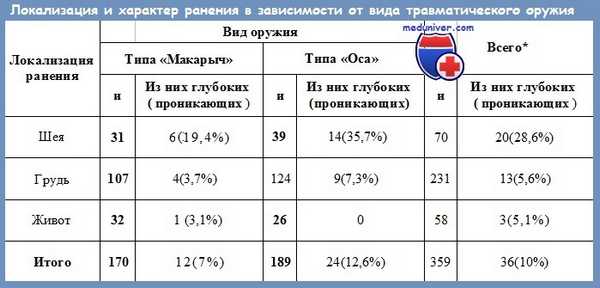 В таблице представлены локализация и характер ранений в зависимости от вида травматического оружия. При этом у 225 пострадавших ранения были изолированными, у 97 (30%) они сочетались с ранениями других областей тела. Всего у 322 пострадавших было 359 ранений шеи, груди, живота.