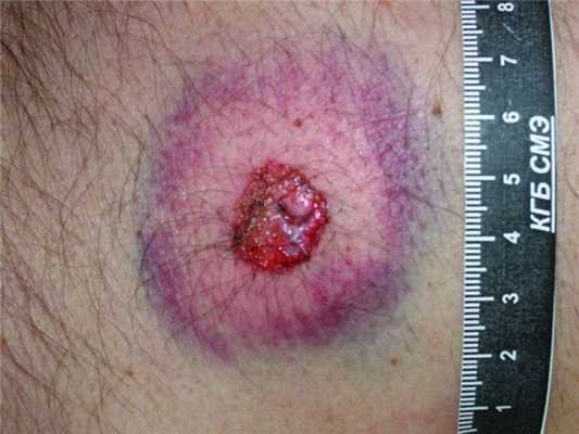 В зоне контактного взаимодействия снаряда с поверхностью кожного покрова отмечали наличие светлого участка шириной 1,0-1,5 см с относительно ровными и четкими краями. По периферии светлого участка регистрировали образование кольцевидного кровоподтека синюшного или синюшно-фиолетового цвета шириной 0,3-1,5 см. Внутренняя граница кровоподтека была четкой, ровной, а наружная - нечеткая, волнистая или зубчатая. В 23 случаях наблюдали своеобразную «лучистость» внешнего края кровоподтека. Кольцевидный кровоподтек имел неравномерную интенсивность: внутренняя часть его была более яркой, багрового или багрово-красного цвета с переходом к багрово-синюшному или бледно-синюшному оттенку по внешнему краю (см. рис. 1, на цв. вклейке). Рисунок 1. Рис. 1. Кольцевидный кровоподтек от действия эластического огнестрельного снаряда патрона «Терен 3ФП» при выстреле из пистолета ПМР.