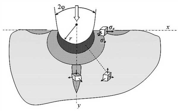 По мере углубления тупого индентора в упругое полупространство, перед ним формируется зона в виде полусферы, на границе которой зарождаются растягивающие напряжения. Проникая дальше, по направлению действия внешней силы, возникает зона пластической деформации (напряжения формируют чистый сдвиг), а вслед за ней - зона хрупкого разрушения (двуосное растяжение). Таким образом, при внедрении тупого предмета в упругое полупространство разрушение осуществляет формируемая зона гидростатического сжатия, размер которой равняется 2-3 радиусам индентора [5].