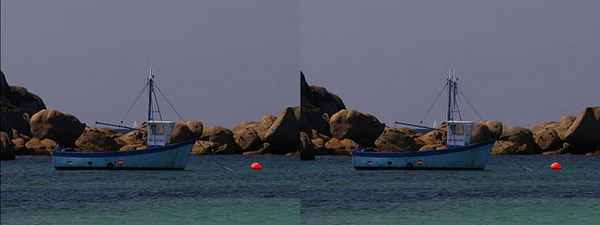 Пример двоения в глазах (диплопии) из-за неисправленного косоглазия (справа); это двоение в глазах обычно влияет только на центр поля зрения, в данном случае на мачту лодки (щелкните, чтобы увеличить).