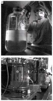 Рис. 12.14. А. Сосуд со стартовой культурой клеток млекопитающих, используемой для производства моноклональных антител. В сосуде культивируют клетки гибридомы, которые затем используют для размножения в ферментере, чтобы получить антитела. Б. Опытная установка для коммерческой ферментации в биотехнологической лаборатории.