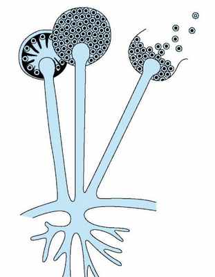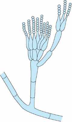 У грибов рода Penicillium (кистевик) плодоносящая гифа напоминает кисточку, так как из нее (на конидиеносце) образуются утолщения, разветвляющиеся на более мелкие структуры - стеригмы, фиалиды, на которых находятся цепочки конидий. Некоторые виды аспергилл могут вызывать аспергиллезы и афлатоксикозы, пенициллы могут вызывать пенициллиозы.