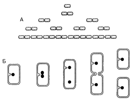 Рис. 7. Бесполое размножение бактерии: А — общая схема размножения; Б — схема деления клетки