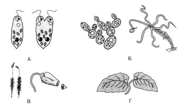 Рис. 8. Виды бесполого размножения: А — простое деление надвое эвглены зеленой (продольное); Б — почкование дрожжей и гидры; В — споруляция мхов; Г — вегетативное размножение листьями бегонии
