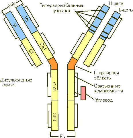 Построены по единому принципу. Общая структурная единица- мономер- это 4 полипептидные цепи, из которых 2 легкие и 2 тяжелые, соединенные дисульфидными связями.