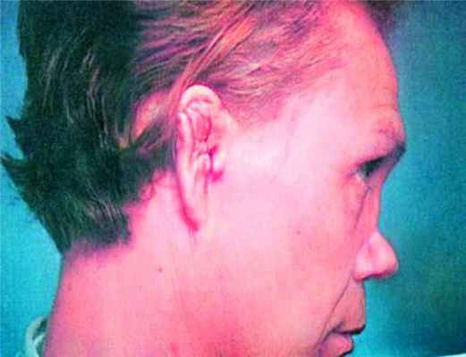При осмотре обращала на себя внимание деформация ушных раковин и носа. Уши уменьшены за счет сморщивания хрящей, нос седловидный, с резко запавшей спинкой (рис. 3). Рисунок 3. Пациент Ч. Деформация ушных раковин, седловидный нос.