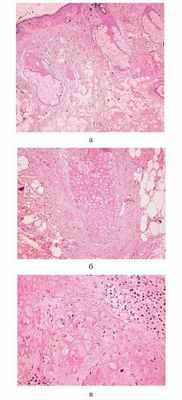 | Рис 3а. Гистологическое исследование биопсии ушной раковины Ув. 1:40 | Рис 3б. Гистологическое исследование биопсии ушной раковины Ув. 1:400 |