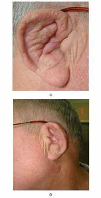 Специальный статус: патологический процесс симметричный, локализуется на обеих ушных раковинах, кожа которых умеренно гиперемирована. Ушные раковины сморщены, деформированы, имеют вид «мокрой тряпки» (рис. 1). Рисунок 1. Пациент Ж. Деформация правой (а) и левой (б) ушной раковины по типу «мокрая тряпка».