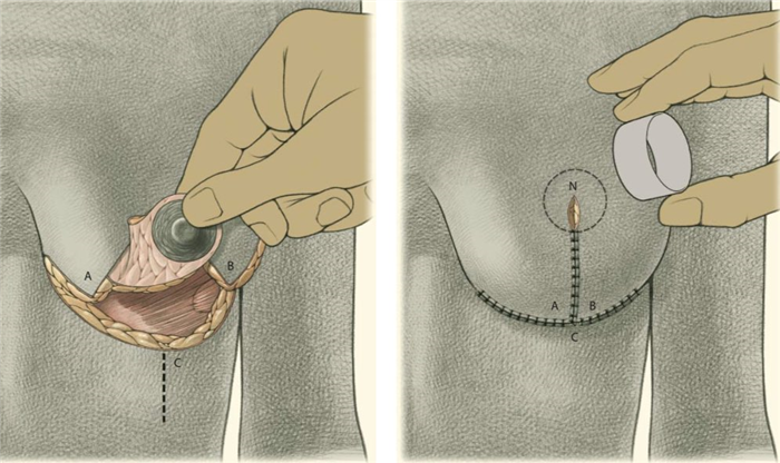 Разрез идёт по краям ареолы вниз к субмаммарной (под грудью) складке. Такой разрез ещё называют «замочной скважиной», так как он напоминает её по форме. Используют этот доступ, когда птоз (провисание) кожи и сами объёмы молочной железы выражены средне — тогда это не вызывает сложности для проведения пластики груди.
