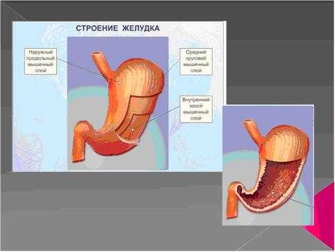 Стенка желудка состоит из трех слоев: наружного – серозного, среднего – мышечного и внутреннего – слизистого. Сокращения мышц желудка вызывают как волнообразные (перистальтические), так и маятникообразные движения, благодаря которым пища перемешивается и передвигается от входа к выходу из желудка. В слизистой оболочке желудка находятся многочисленные железы, вырабатывающие желудочный сок. Из желудка полупереваренная пищевая кашица (химус) поступает в кишечник. На месте перехода желудка в кишечник находится пилорический сфинктер, который при сокращении полностью отделяет полость желудка от двенадцатиперстной кишки. Слизистая оболочка желудка образует продольные, косые и поперечные складки, которые расправляются при заполнении желудка. Вне фазы пищеварения желудок находится в спавшемся состоянии. Через 45 – 90 минут периода покоя возникают периодические сокращения желудка, длящиеся 20 – 50 мин (голодная перистальтика). Вместимость желудка взрослого человека составляет от 1,5 до4 л.