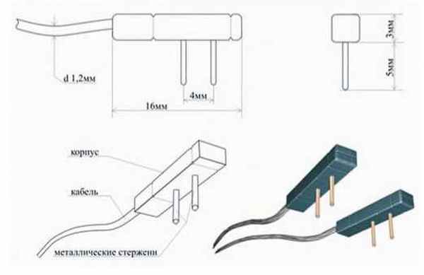 Датчик представляет два комбинированных миокардиальных электрода для четырехполюсного измерения. Небольшие размеры и форма электродов предусматривали его надежную фиксацию к миокарду. Корпус выполнен из композиционного материала, который обеспечивает герметичную конструкцию электрода. В нижней части корпуса расположены два стержня, из сплава благородных металлов. В конструкцию одного из электродов встроен термоэлемент для измерения температуры миокарда (рис. 1).