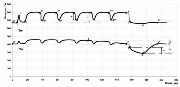 При анализе материала выявлены общие закономерности изменения электрического импеданса миокарда (рис. 3).