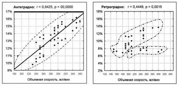 В случае с ретроградным введением раствора через коронарный синус, данные оказались не коррелируемы. Но при детальном разборе диаграммы рассеяния можно заметить разнородность данных, область которых помечена пунктирной линией (рисунок 4, справа). В подобных ситуациях низкая корреляция может быть следствием разбиения данных на две группы, а вовсе не отражать «истинную» зависимость между двумя переменными.
