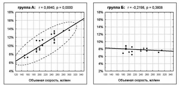 Чтобы найти зависимость между объемной скоростью введения кардиоплегического раствора и снижением низкочастотного импеданса, мы попытались определить степень, с которой значения двух переменных «пропорциональны» друг другу. Для решения этой задачи был использован метод простой линейной корреляции Пирсона (рис 4.).