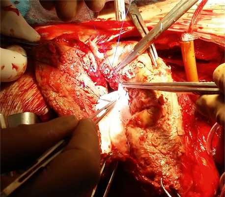 Рис. 5. Интраоперационное фото. Геометрическая реконструкция левого желудочка синтетической заплатой из ПТФЭ.
