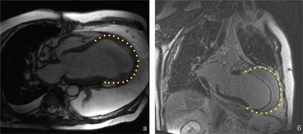 Рис. 1. МРТ сердца до операции. а — четырехкамерная проекция; б — двухкамерная проекция. Желтая пунктирная линия — границы рубцовой ткани.