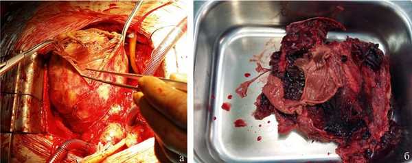 Рис. 3. Интраоперационное фото. а — тромб в полости левого желудочка; б — тромботические массы после удаления.
