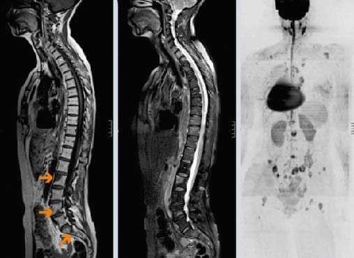 (Справа) На сагиттальной MPT (Т1 ВИ) определяются множественные остеобластические метастазы с сигналом крайне низкой интенсивности, свидетельствующим о их бластическом характере. Типоинтенсивный сигнал должен сохраняться и во всех стальных последовательностях.