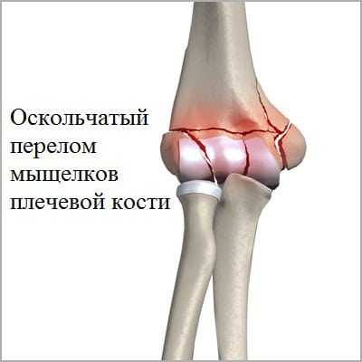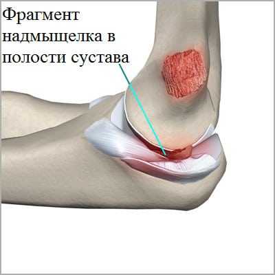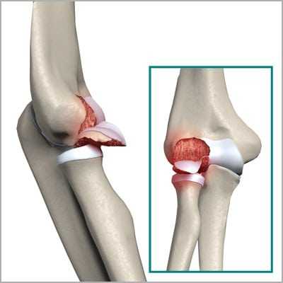 Частая травма локтя — отрыв медиального надмыщелка, сопровождающийся его переломом, из-за запредельной тяги коллатеральных связок. Происходит отсоединение костного отломка, попадающего в суставную полость и полностью блокирующего движения. Попытка согнуть или разогнуть локоть приводит к возникновению сильной, пронизывающей боли. Показана открытая операция с фиксацией костного фрагмента к участку отрыва. Иногда восстановить сочленение возможно консервативным способом, но только при нахождении отломка рядом с местом его отрыва.