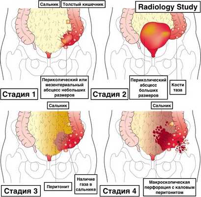 - Стадия II: крупный абсцесс в тазу или ретроперитонеальный.