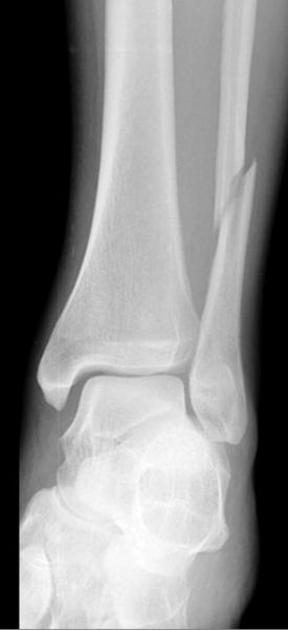 Малоберцовая кость: Косой или торзионный перелом, начинающийся от уровня голеностопного сустава и идущий в проксимальном направлении. Линия перелома может быть гладкой или изломанной, что зависит от приложенной силы.