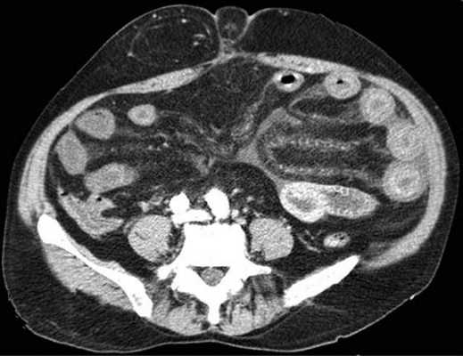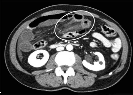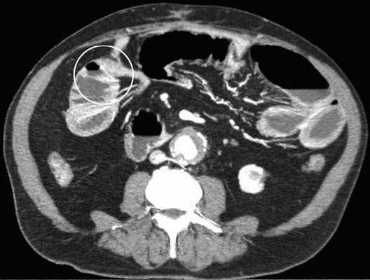 (Справа) На аксиальной КТ с контрастным усилением у этой же пациентки визуализируются другие сегменты тощей кишки с утолщенной стенкой. Мальротация подтвердилась на операции наряду с ишемическими изменениями тощей кишки, которая была пережата из-за спаек.
