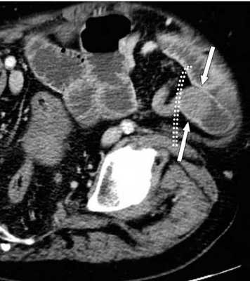 -нарушение нормального контрастного усиления стенок кишки. Изменения варьируют от гиперконтрастирования до полного отсуствия контрастного усиления. Различные варианты этих изменений между описанными выше крайностями могут наблюдаться одновременно в разных сегментах тонкой кишки. Полное отсутствие усиления означает артериальный рефлекторный спазм и свидетельствует в пользу тяжести поражения;