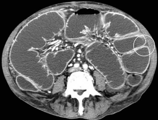 Для странгуляции тонкой кишки характерны утолщение стенок кишечника, васкулярные нарушения и выраженные патологические изменения в брыжейке и в брюшной полости. Диагностические находки включают в себя: