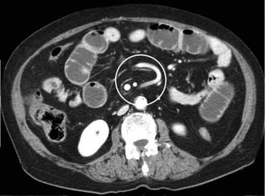 (а) При КТ с контрастированием в аксиальной проекции выявлена транспозиция верхней брыжеечной артерии (указатель) и вены (стрелка).