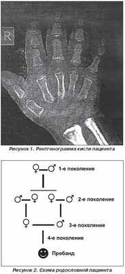 Со слов родителей, пациент жалуется на низкорослость, проблемы при ходьбе. При обследовании было установлено: рост 76,0 см, вес — 10,8 кг. Дефицит роста — 37 см, дефицит веса — 9 кг. Пубертатный статус: Ах0Рх0, testis 3,0 x 3,0 ml, penis длиной 1,0 см. Гормональные исследования: СТГ — 1,4 мМЕ/л (в норме у детей от 5 до 16 лет 2,10 ± 0,53 мМЕ/л, св. Т4 — 124 нмоль/л (60–160), ТТГ — 1,9 мМЕ/л (в норме 0,17–4,05), ИФР–1 — 101 нмоль/л. При МРТ турецкого седла (01.12.14) была обнаружена гипоплазия гипофиза: высота 0,1 см, переднезадний размер — менее 0,4, поперечник — до 0,4 см. На рентгенограмме кисти (02.12.14): костный возраст от трех до 24 мес., нарушение последовательности появления точек окостенения. Зоны роста открыты, сужены, укорочение всех фаланг пальцев. Заключение: муковисцидоз? гипохондроплазия? (рис. 1).