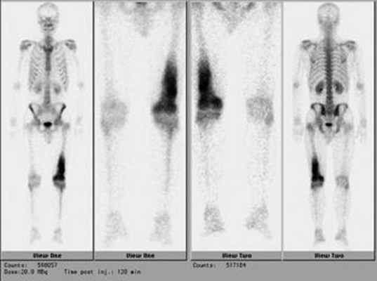 Планарная сцинтиграфия дает возможность определить распространенность опухоли по длине кости, а также выявляет отдаленные метастазы остеосаркомы в скелете (рис. 5).
