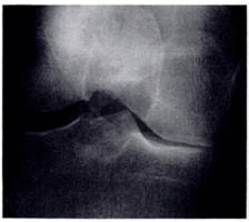 (Справа) Рентгенография в ПЗ проекции: пример раннею ОА, характеризующегося исключительно формированием остеофитов. При рентгенографии, выполненной с осевой нагрузкой, признаки нарушения соосности и утраты хряща не определяются. Остеофиты визуализируются только в области межмыщелковго возвышения большеберцовой кости. (Слева) Рентгенография в боковой проекции, этот же пациент: определяются остеофиты надколенника. Также визуализируется субхондральный остеофит поверхности мыщелка бедренной кости. Субхондральные остеофиты часто сопровождаются фокальным дефектом хряща, что в этом случае подтвердилось при МРТ. Обратите внимание на отсутствие свободных тел.