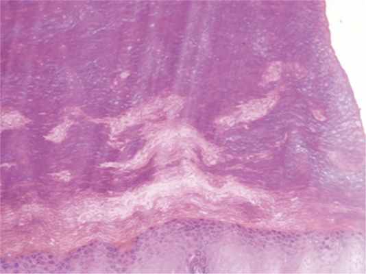При гистологическом исследовании в препаратах, окрашенных гематоксилином и эозином, в эпидермисе были выявлены: акантоз, гипергранулез, выраженный ортогиперкератоз; в дерме определялось незначительное увеличение количества фибробластов, мелкоочаговые отложения муцина (рис. 3, 4, 5, 6).