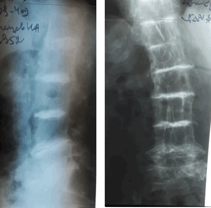 (Справа) На рентгенограмме поясничного отдела позвоночника в прямой проекции в дополнение к левосторонней дегенеративной сколиотической деформации определяется выраженное снижение высоты и кальцификация межпозвонковых дисков.