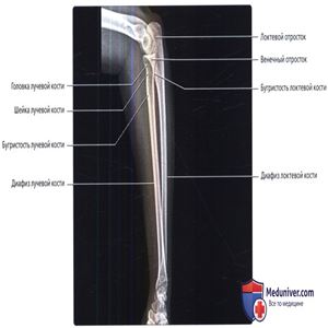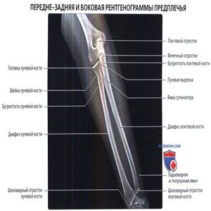 На ПЗ рентгенограмме виден небольшой изгиб как лучевой, так и локтевой костей в норме.